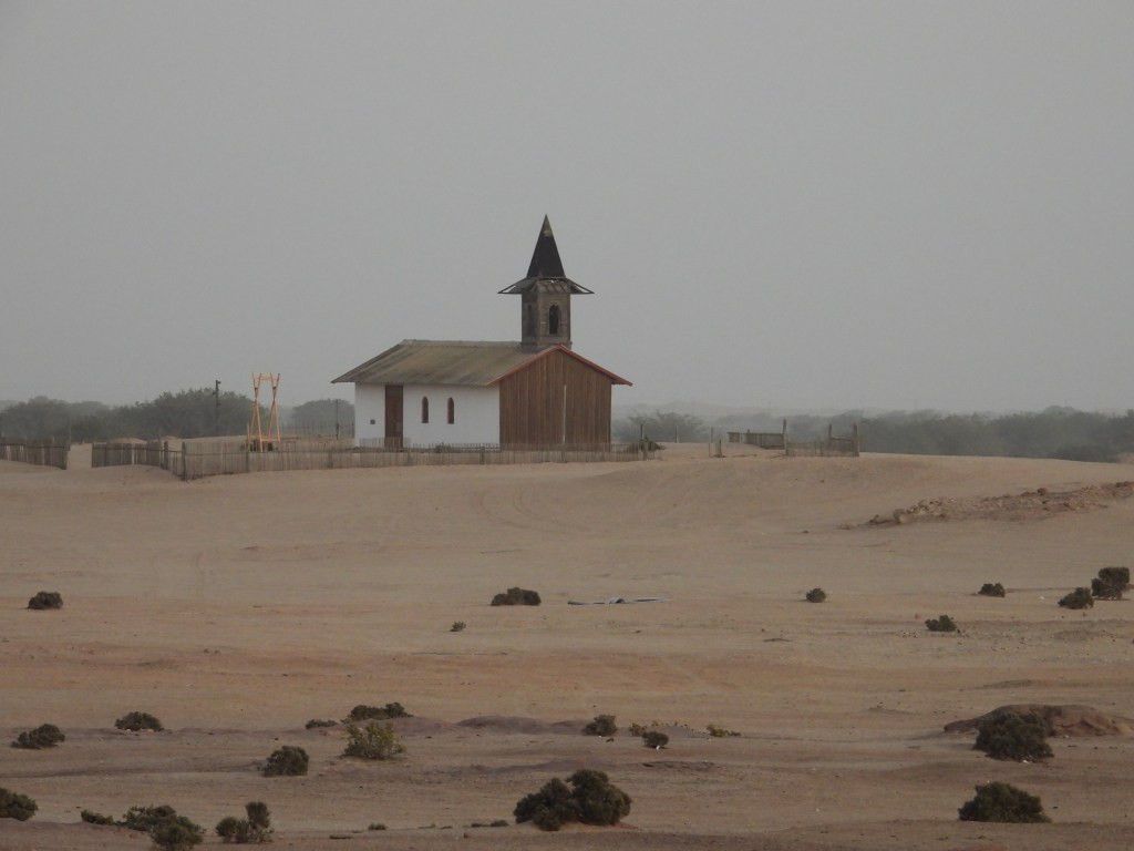Namibia’s only strictly endemic bird is a lark called the Dune Lark. We later went searching for it by Rooibank, which is close to Walvis Bay. The first place we checked out was a bust as far as finding the lark went, but the area was quite photogenic due to a lone church out in the desert and a farm with a rather impressive sand dune backdrop.