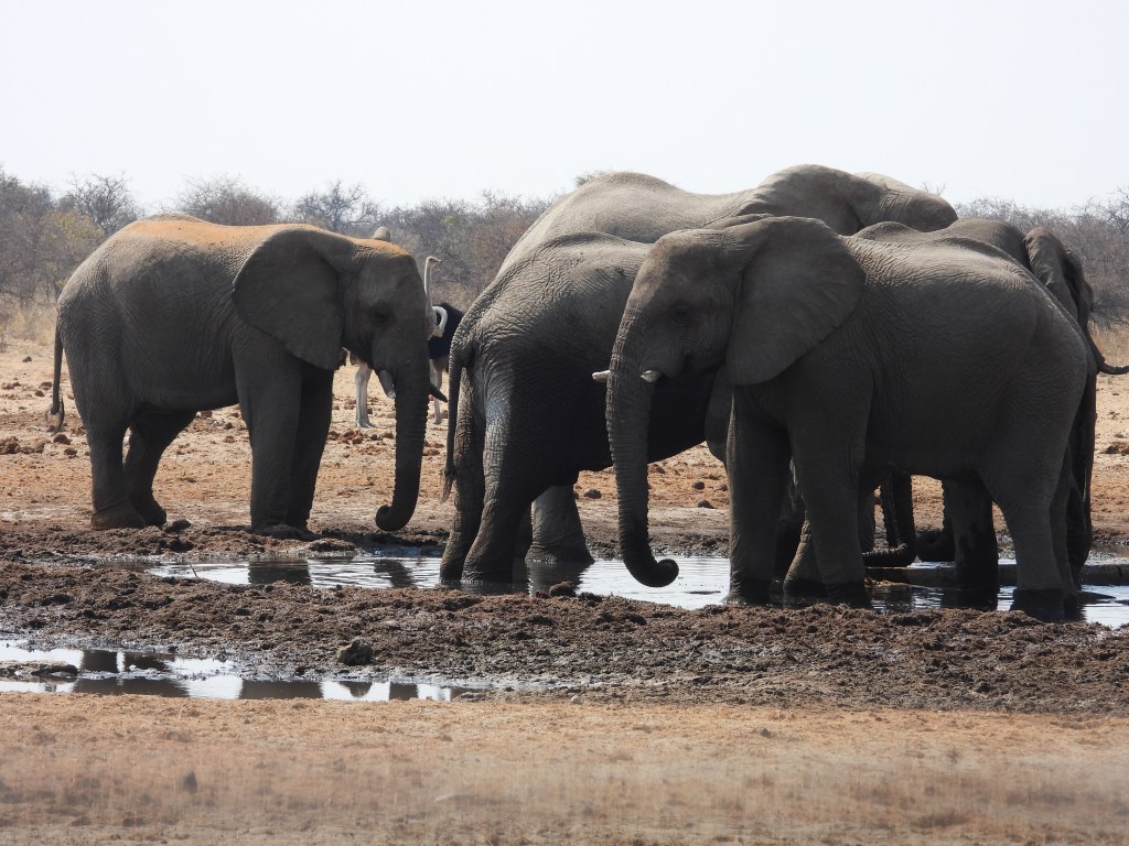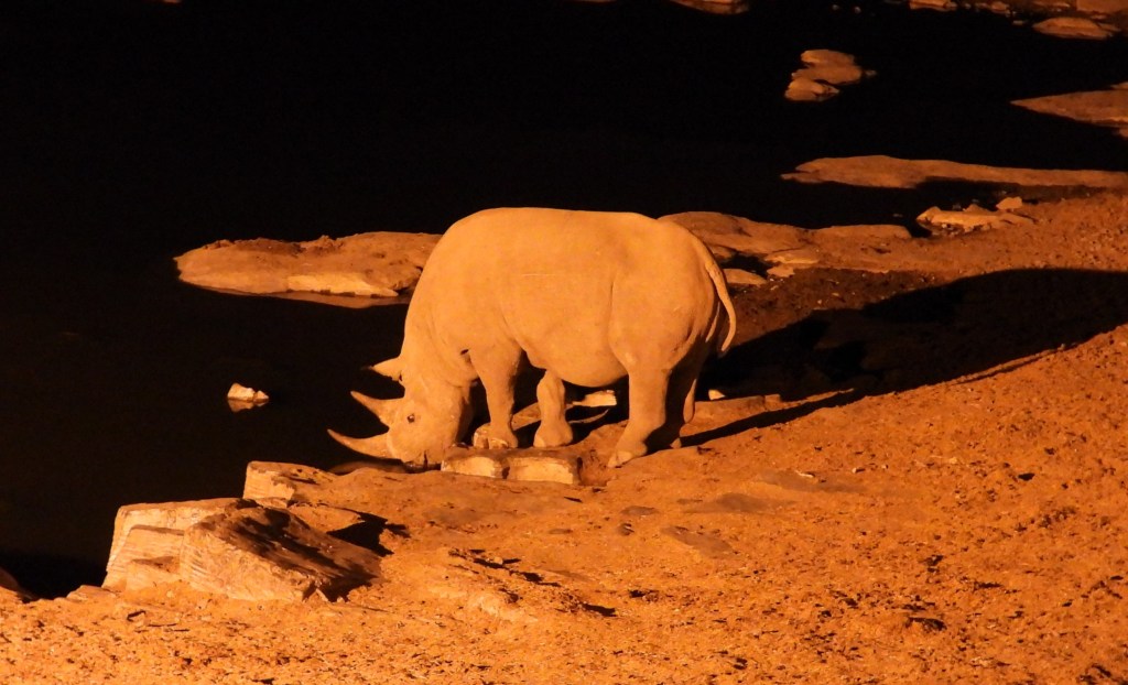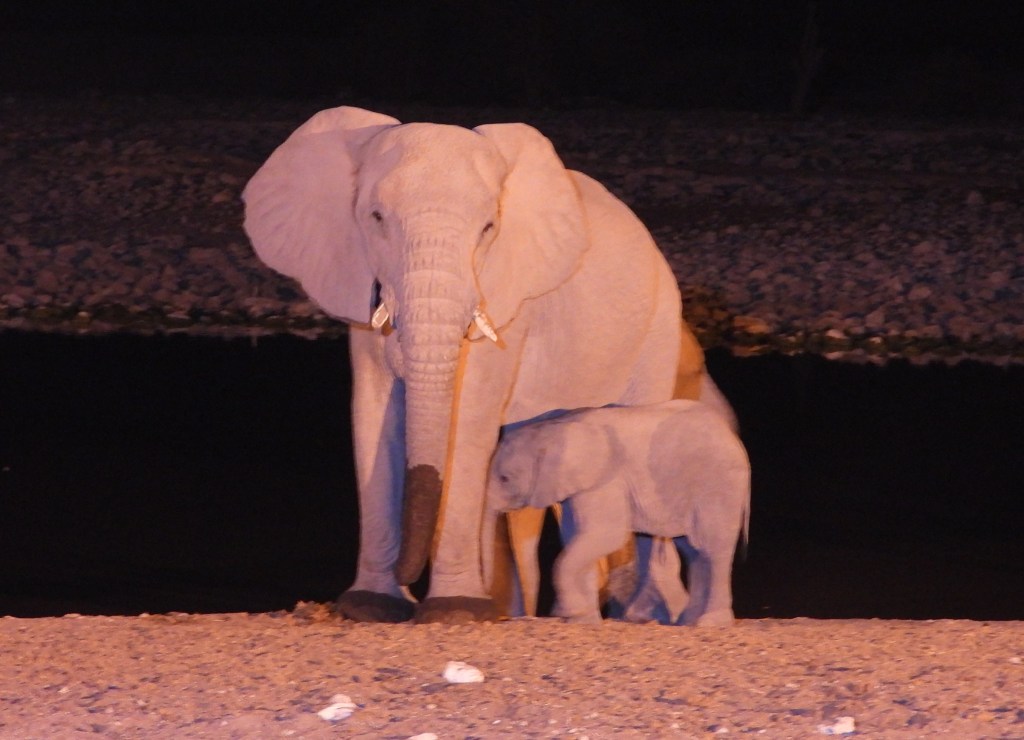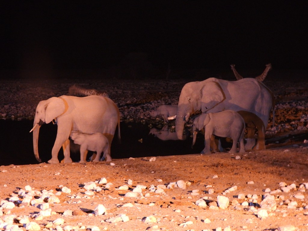 The Okaukuejo waterhole becomes very busy just after dark, and there are floodlights so visitors can see the animals. After dark is typically when the elephants and rhinoceros arrive.