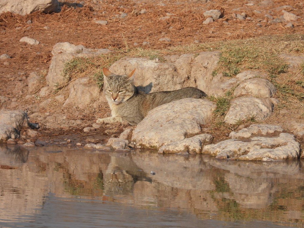 We did find one of the smaller cat species – an African wild cat. This one was sitting at a waterhole, trying to catch one of the sandgrouse that arrive in the morning to drink. The sandgrouse did seem aware of the wild cat and they avoided the side of the waterhole it was on. The cat made a jump at some sandgrouse that got close to him, but he didn’t manage to catch one.
