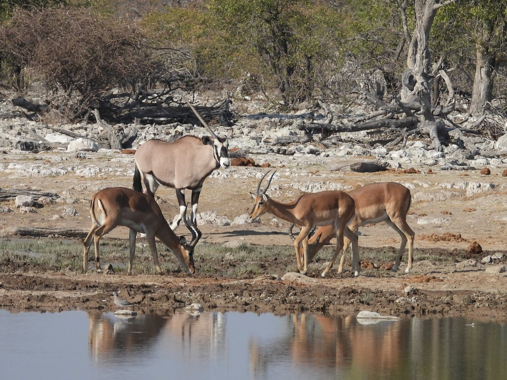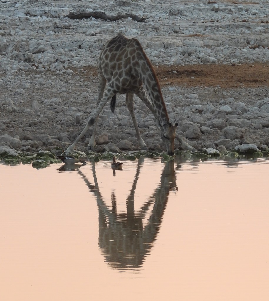 The waterhole at the Okaukuejo camp in particular attracts a lot of animals so I spent time there when I could. The first animals I saw heading to the waterhole just prior to sunset were oryx, zebra, and giraffe. I noticed that these animals were very wary about approaching the waterhole, presumably because they knew that there could be predators nearby. I watched a pair of oryx and a giraffe very slowly approach the waterhole in a zigzag pattern before they actually went up to it to take a drink. The rhinos and elephants that showed up later were different – not much can prey on them so they could confidently walk up to the waterholes to drink.