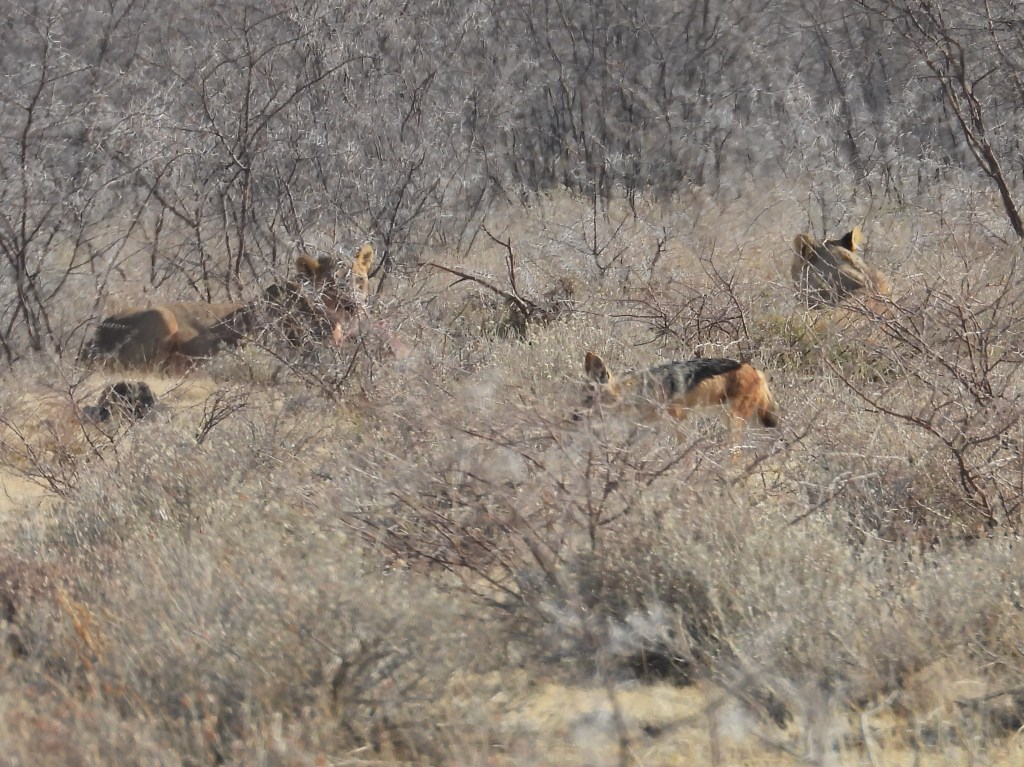 Lions are one of the species that the fence is meant to contain. We saw a few groups of lionesses in the park, including one that had a jackal circling them. The jackal was likely trying to steal some meat off of a kill. There are leopards and cheetahs in the park, but they are more difficult to find than lions.