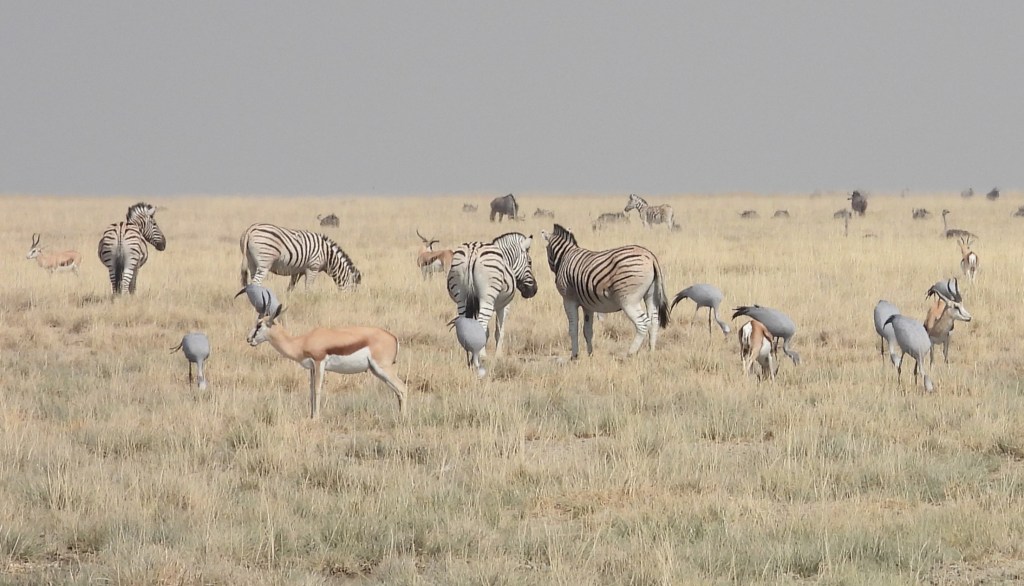 We also managed to spot a group of Blue Cranes in eastern Etosha. Etosha is the only place in Namibia where these elegant and rare birds can be seen. The cranes we found were intermingled with a large group of mammals including wart hogs, oryx, plains zebra, red hartebeest, springbok, and kudu.