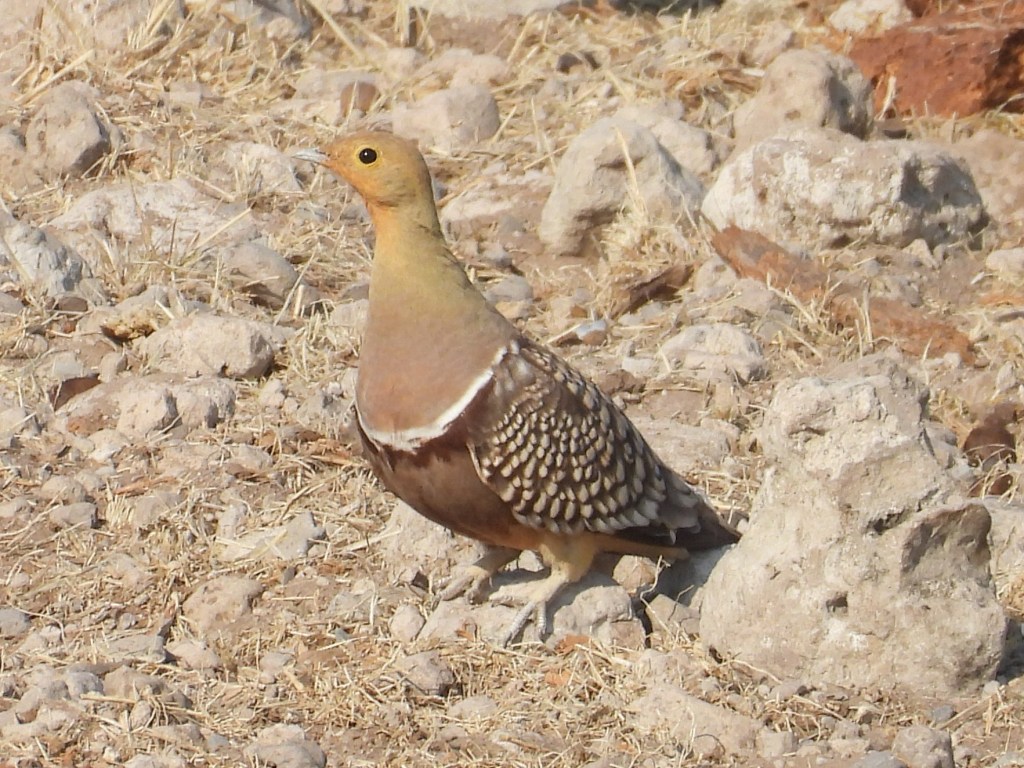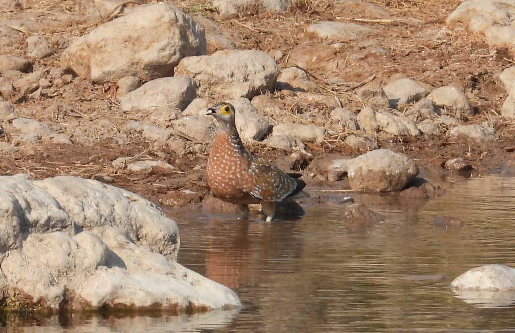 Both Burchell’s and Namaqua Sandgrouse did eventually land at the waterhole, on the side opposite the cat. Sandgrouse (family Pteroclidae) are very well-adapted to arid habitats. They frequently nest far from waterholes, but the chicks cannot fly until they are about one month old. How do they get enough water? They get it from their father’s feathers! The feathers on the males’ chests are somewhat sponge-like and can absorb and retain up to 25 mL of water at a time. It’s therefore not unusual to see sandgrouse dipping their chests into water. Their chest feathers soak up water, and when the male returns to the nest, the chicks can obtain water from his chest feathers.