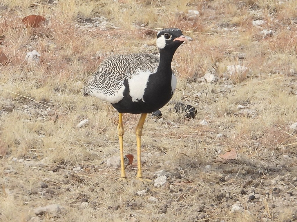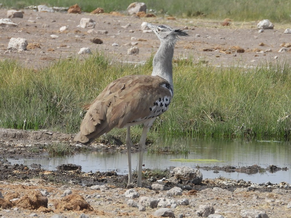 Bustards (family Otididae), including the impressive Kori Bustard, are common in Etosha. The Kori Bustard is oft said to be the world’s largest flying bird, as males can weigh up to 40 pounds. Bustards do, however, seem to prefer walking to flying. Bustards typically prefer open habitats, so they are easy to find in Etosha. We found three species of bustard in the park: Kori, White-quilled, and Red-crested.