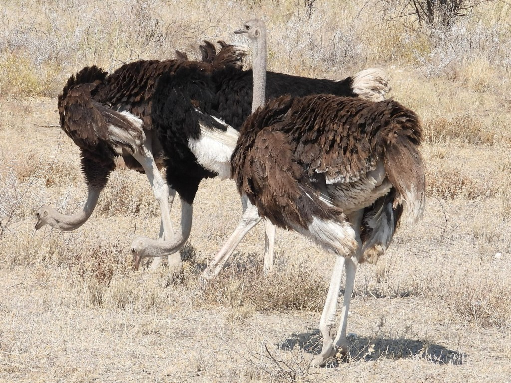 Wild ostriches – which can stand over six feet tall – occur throughout Namibia. We saw several of them during each day spent in the park. They prefer open habitats with short vegetation, and they can thrive in arid regions due to their ability to go without drinking for several days. As they cannot fly and spend a lot of time out in the open, they must rely on their speed to evade predators. Ostriches can run at speeds of up to 70 km/hr, so even very speedy predators like cheetahs may find ostriches to be a very challenging quary. They also have very powerful kicks. Nonetheless, ostriches are sometimes captured by various large predators.