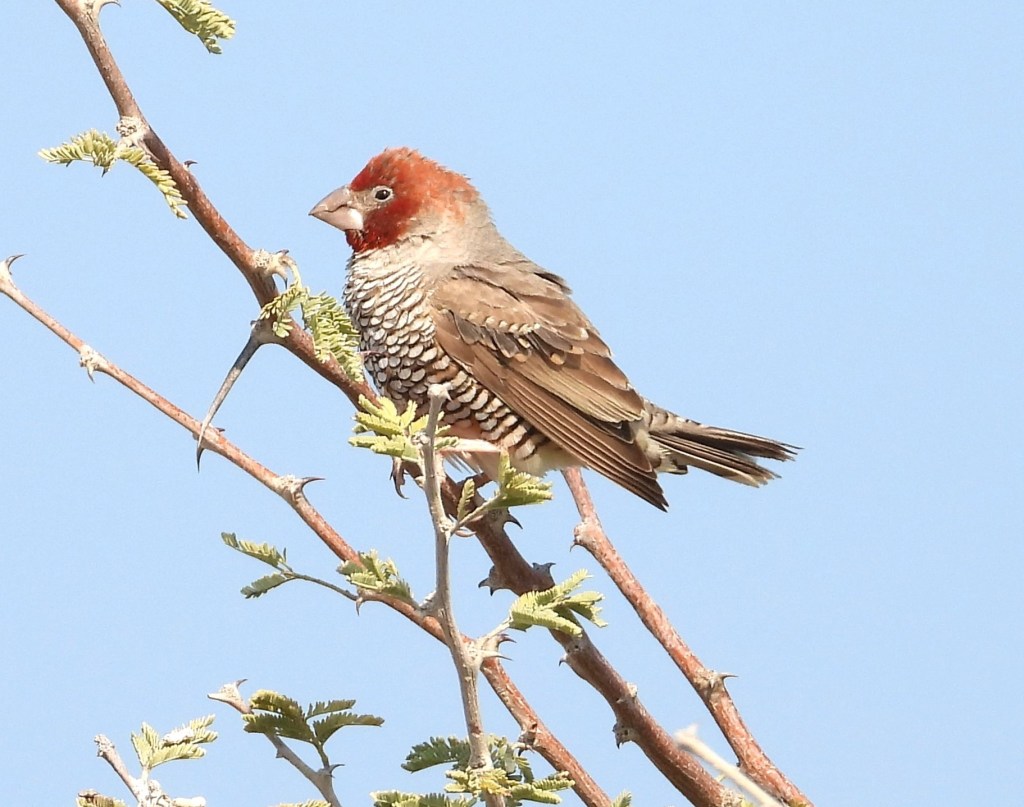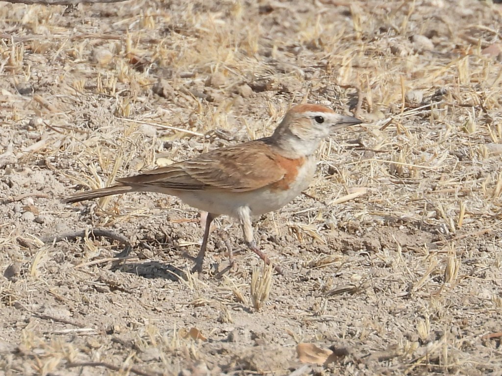 Larks (family Alaudidae), which are plain brown and gray songbirds that prefer dry, open habitats, are plentiful in Etosha as well. We found Spike-heeled Larks, Gray-backed Sparrow Larks, Sabota Larks, Eastern Clapper Larks, Stark’s Larks, and Red-capped Larks in the Park. They were often present along the roadsides, but if they aren’t moving, they are tricky to see because they blend in so well with their habitats.