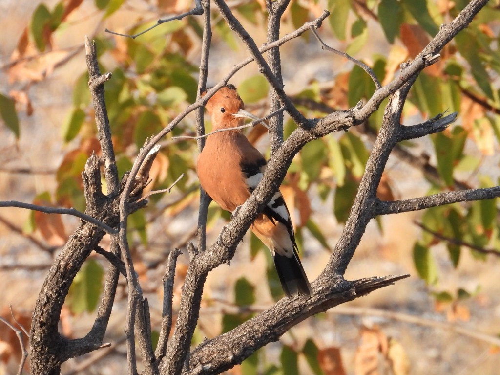 African Hoopoes are another distinctive bird species that occurs throughout Namibia in almost any type of shrubby or forested habitat. They are very distinctive birds due to their orange feathers, spiky crests and long, decurved bills. They are also very conspicuous in flight, due to their bold black and white wing stripes.