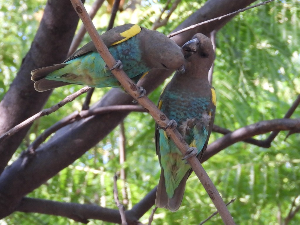 The beautiful turquoise, gray, and yellow Meyer’s Parrot also occurs in the woodlands of Etosha. The pair I managed to photograph (below) were part of a small flock that was resting and foraging at the top of a tall acacia tree just outside the eastern boundaries of the park.
