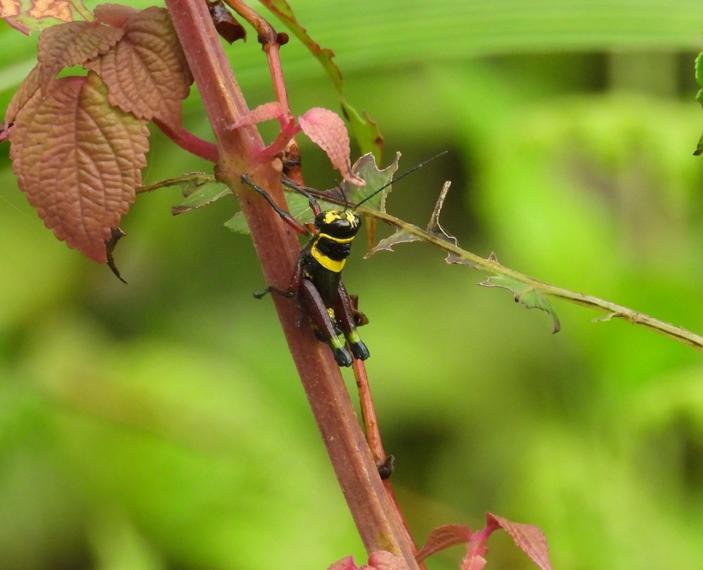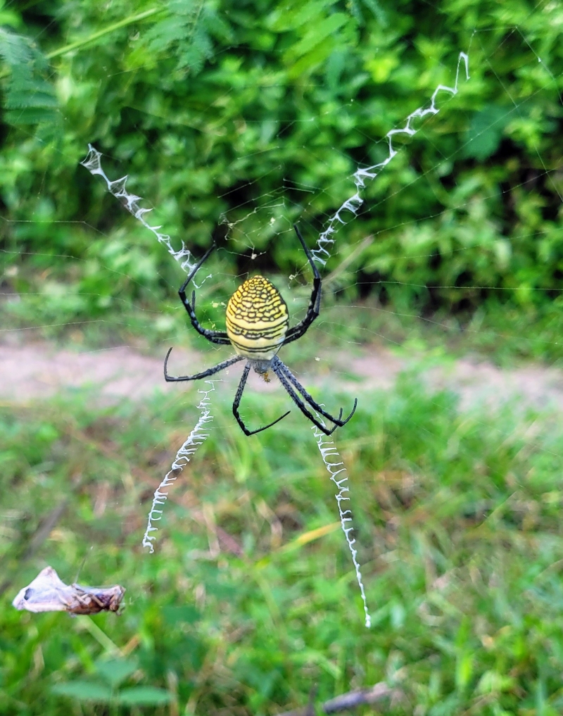 This was a birding tour, but a lot of the invertebrates were hard not to notice. Large, colorful orb-weaver spiders were common and the big females were particularly conspicuous due to their bright yellow abdomens and elaborate webs. They also tend to sit right in the middle of their webs during the daytime. These spiders seem to have an eye for art, as they often add attractive zig-zag designs onto their already impressive webs. Some decorate their webs with other material as well.