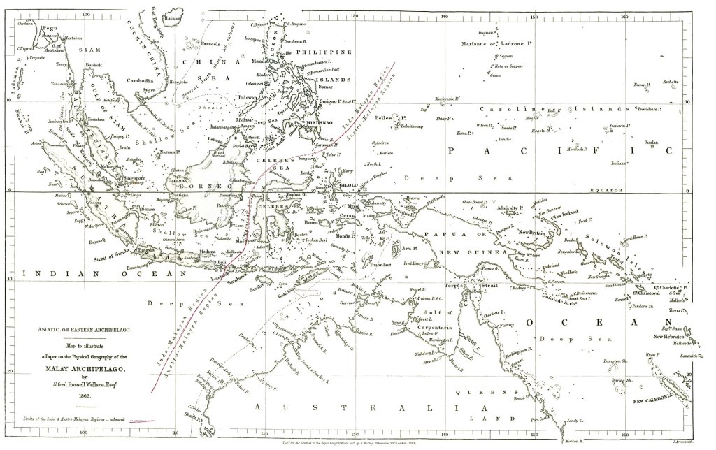 Wallace took copious notes on the plants and animals he saw on the different islands and he, along with a large crew of assistants, gathered thousands of specimens, most of which he sold to museums and other collectors. Wallace eventually wrote a paper on his observations of biogeography entitled On the Physical Geography of the Malay Archipelago. This paper included the below map, which shows a line dividing what he called the Indo-Malayan Region and the Austro-Malayan region.