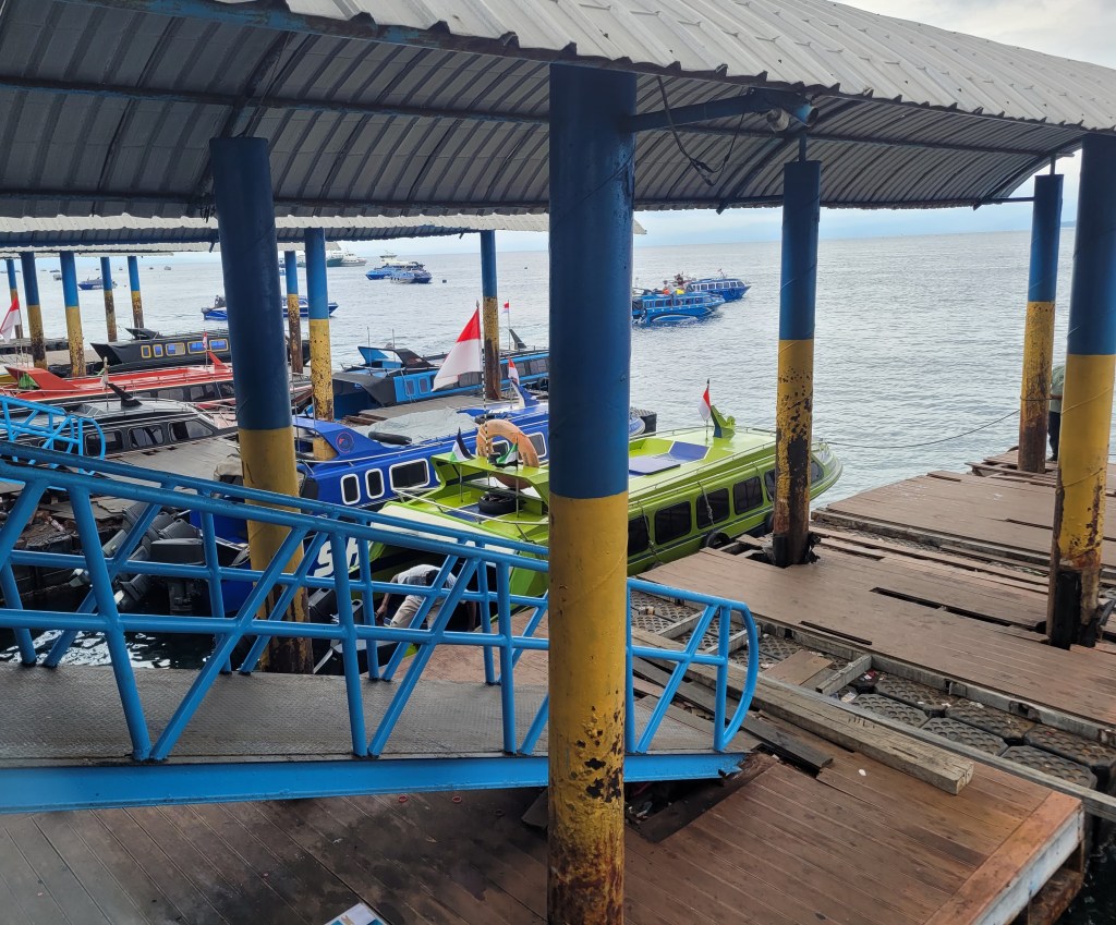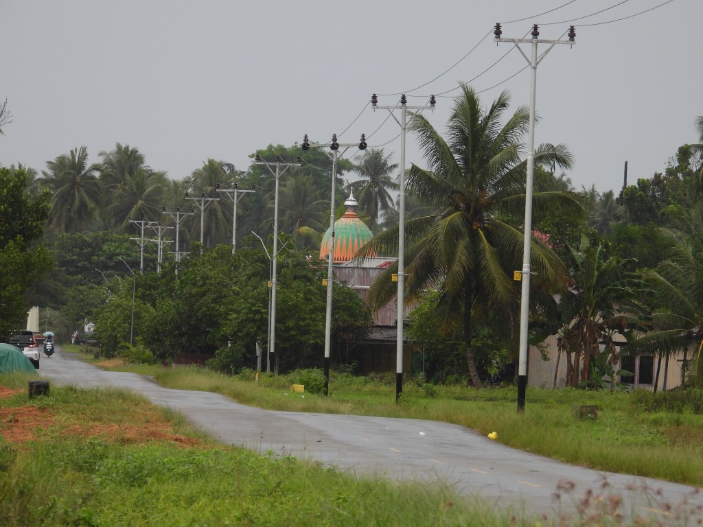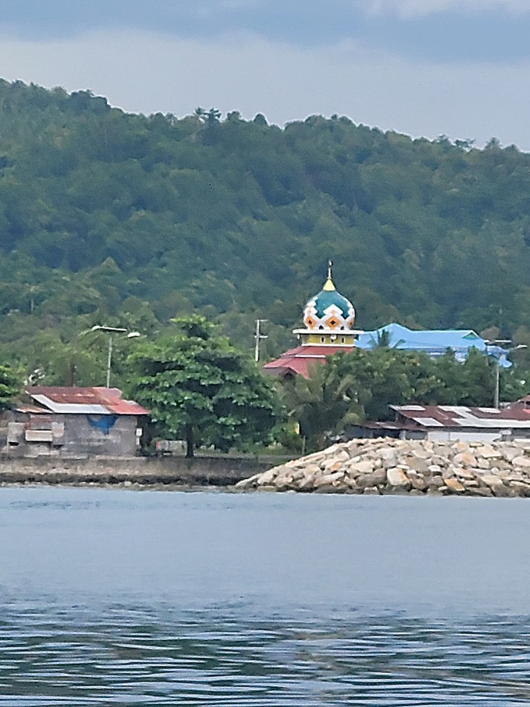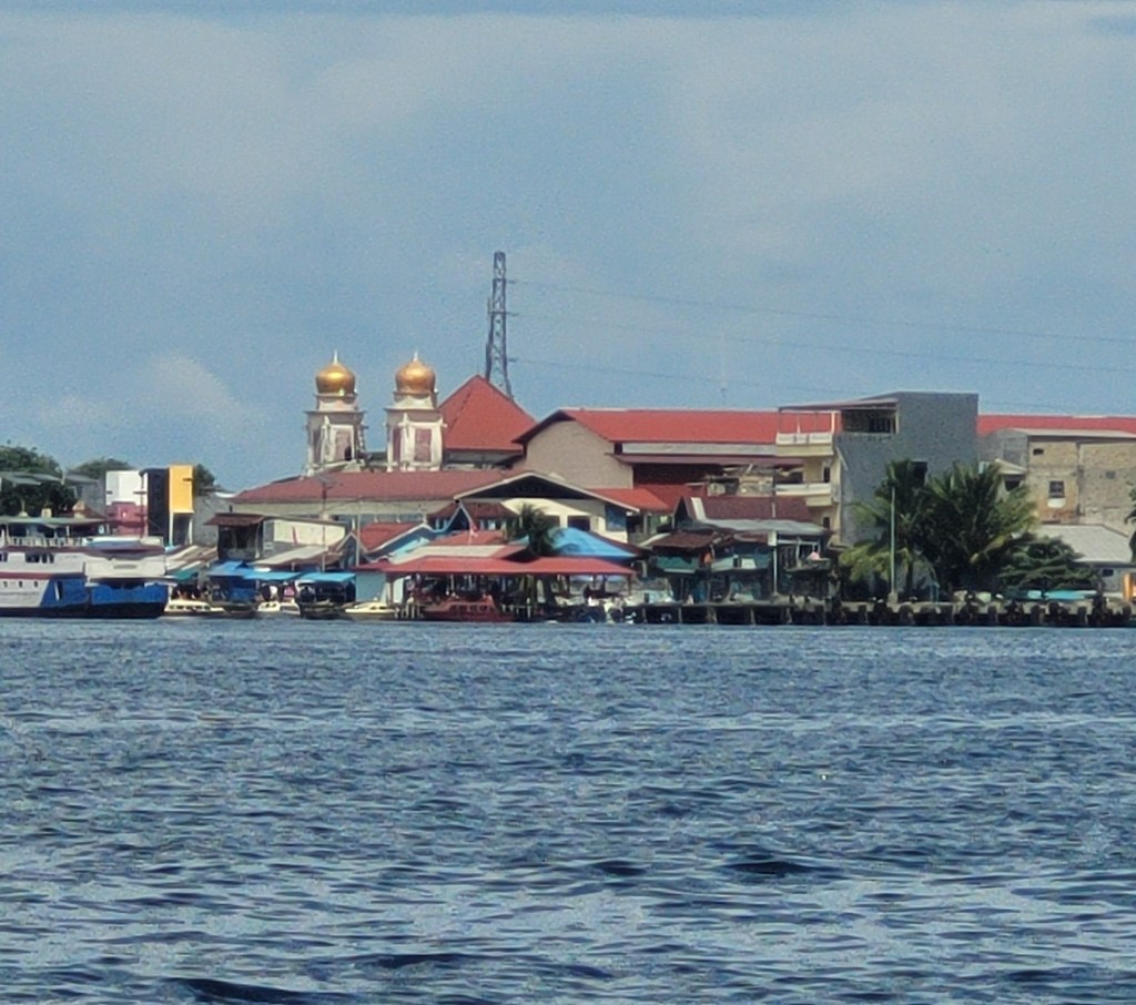 The group I was with had lunch at a busy restaurant on Ternate and then headed to the docks to take a speedboat ride to Sofifi, a town on Halmahera. Ternate itself is a very colorful city with a lot of beautiful buildings, so I tried to get a lot of photos of it from the boat but the ride was bumpy so that was a bit difficult. I loved the colorful domes that topped many of the mosques.