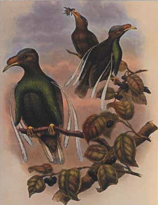 I now saw that I had got a great prize, no less than a completely new form of the Bird of Paradise, differing most remarkably from every other known bird. The general plumage is very sober, being a pure ashy olive, with a purplish tinge on the back; the crown of the head is beautifully glossed with pale metallic violet, and the feathers of the front extend as much over the beak as in most of the family. The neck and breast are scaled with fine metallic green, and the feathers on the lower part are elongated on each side, so as to form a two-pointed gorget, which can be folded beneath the wings, or partially erected and spread out in the same way as the side plumes of most of the birds of paradise. The four long white plumes which give the bird its altogether unique character, spring from little tubercules close to the upper edge of the shoulder or bend of the wing.